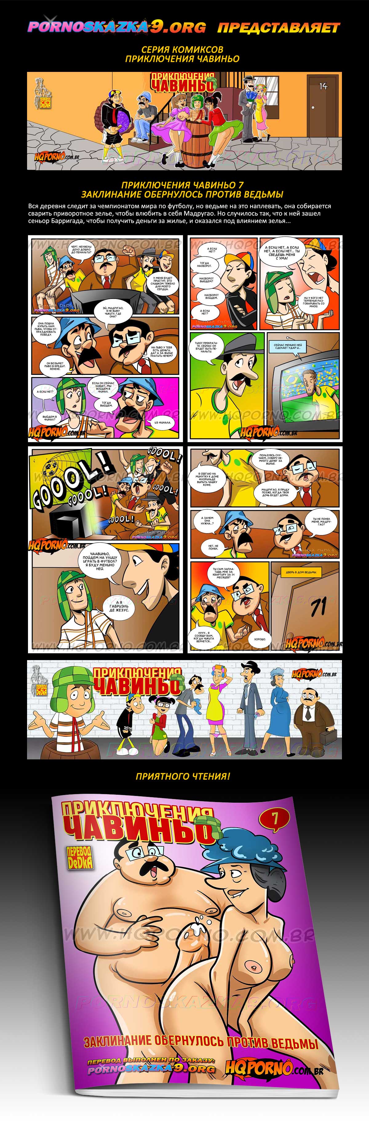 Порно комикс «Приключения Чавиньо. Часть 7. Заклинание обернулось против ведьмы.» Вся деревня следит за чемпионатом мира по футболу, но ведьме на это наплевать, она собирается сварить приворотное зелье, чтобы влюбить в себя Мадругао. Но случилось так, что к ней зашел сеньор Барригада, чтобы получить деньги за жилье, и оказался под влиянием зелья…